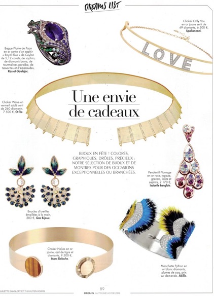 PresseMagazine FLOW -Décembre 2019Les créations Sarah Leroy ont fait l’objet de nombreuses publications dans la presse, présentant ses bijoux et pièces uniques. AIR FRANCE MADAME • 2017 Doolittle • 2015 DREAMS • 2016 MADAME FIGARO • 2017 mariée magazine • 2016 PALACE COSTE • 2017 VOGUE • 2017
